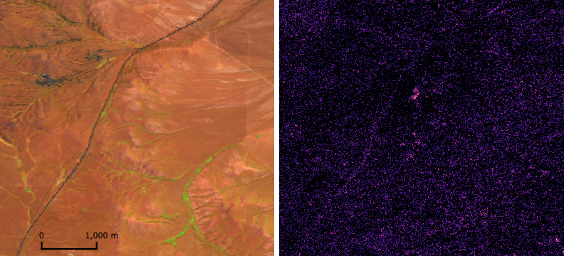 Figure 1. False color image from L2A orthocorrected reflectance (left) and methane enhancement (right) derived from AVIRIS-5 data acquired on 2025-08-05 over a location northeast of Wells, Nevada, U.S., (approximately 41.351 latitude, -114.795 longitude). Flight scene AV520250805t192437_000.