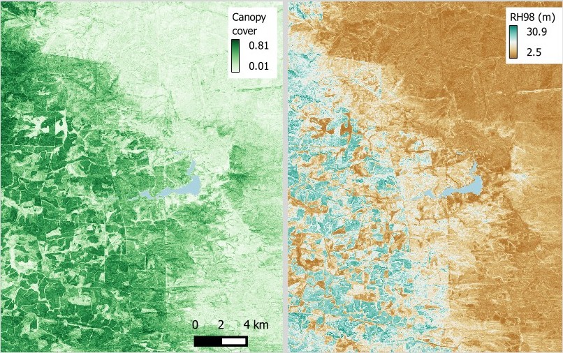 Figure 1. GEDI derived vegetation metrics for a portion of the Greater Kruger National Park region in South Africa in 2022: Fractional canopy cover (left), Relative height 98th percentile (right, units = m). Area depicted is southwest of Bushbuckridge (approximate center: -24.9013 lat, 30.9881 lon).
