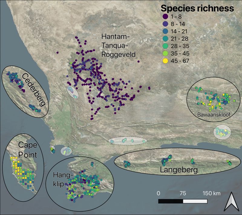 Figure 1. Map of releve plots from the most recent surveys of each subregion. Each releve plot is represented by a single point and is colored by its species richness. The Fynbos dominated subregions are shown with insets.