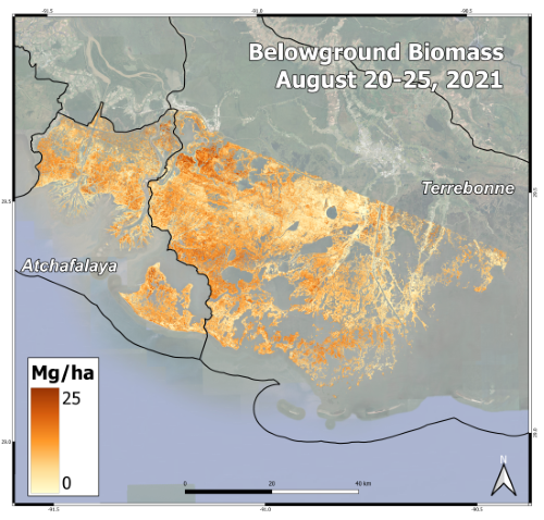 Figure 1. Herbaceous belowground biomass (Mg/ha) in the Atchafalaya and Terrebonne Basins, derived from AVIRIS-NG data collected during the Delta-X August 2021 campaign.