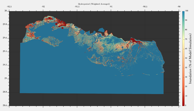 Delta-X: Delft3D FM, Weighted Mean Hydroperiod, MRD, Louisiana, USA