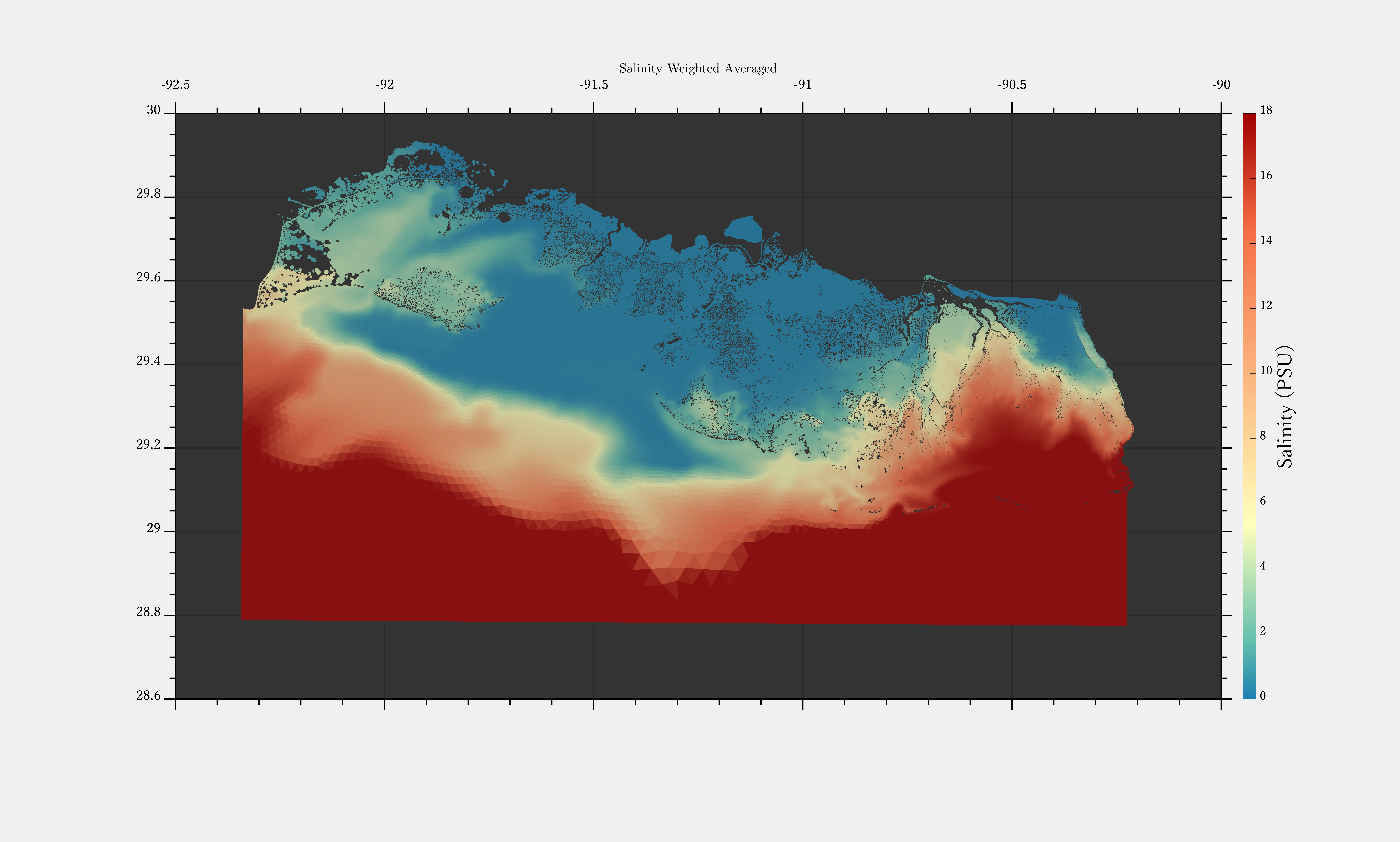 Salinity is calculated by applying a weighted average to the salinity values at each grid cell in the final time step of each simulation. In Payendah et al. (2025a), salinity data for the discharge boundary condition was applied to the Atchafalaya River and Wax Lake Outlet using hourly salinity discharge data from the USGS stations at Morgan City (ID: 07381600) and Calumet (ID: 07381590), respectively, and from the NOAA tide station at Eugene Island (Station ID: 8764314) at the southern model boundary. Refer to Payendah et al. (2025a) for the model salinity input data used for the fall and spring model simulations and additional model details.