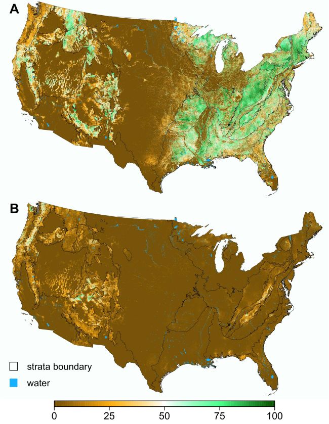 CONUS was segmented into strata based on forest composition and U.S. Environmental Protection Agency Level II and III ecoregions, while trying to maintain at least 100 plots in each class within any given stratum (Figure 2). This resulted in 29 unique strata, all with at least 100 mature, other, and non-forest labels (four strata contained slightly fewer than 100 old-growth labels). The quadratic discriminant analysis (QDA) models were independently calibrated and applied in each stratum. The models predicted a posterior distribution of class membership in each 1-ha land pixel, comprised of the following mutually exclusive classes: non-forest, old-growth-forest, mature-forest, and other-forest. The posterior class distributions were then used to generate two map types that enable broad-scale MOG reporting and localized forest management and conservation activities: the presence probability (1-ha resolution) and land and forest-area proportions (5-km x 5-km resolution; 25 sq-km) of each individual class. The presence probability data file also contains a band for non-forest and all-forest classes (combining the other- mature- and old-growth forest classes). These maps represent the state of U.S. forests circa 2022, the year that best matches the range of dates used for the remote sensing data. The inventory data span earlier years (approximately 2010-2023) of data collection, so this is an approximate date. For additional details, refer to Bruening et al. (2026).