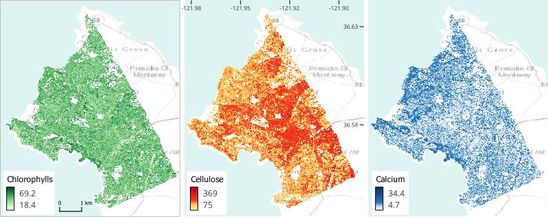 Figure 1. Mean estimates of foliar chlorophyll a+b (micrograms cm-2), cellulose (mg g-1), and calcium (mg g-1) in vicinity of Monterey, California, U.S., derived from AVIRIS-Classic imagery acquired on April 10, 2013. Flight line f130410t01p00r09.